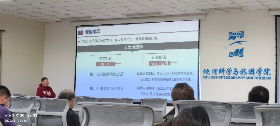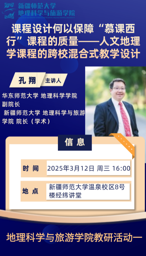 2025年3月12日,yl7703永利在经纬讲堂举办“课程设计保障‘慕课西行’质量—人文地理学跨校混合式教学”教研活动,由华东师范大学地理科学学院副院长,yl7703永利院长(学术)孔翔教授主讲。孔教授介绍了跨校混合式教学背景,分享了其在新师大经历、“慕课西行”计划、华东师大课程参与及教务支持等促成两校合作的因素,并针对学情差异,介绍了团队优化教学设计、共享资源、制定差异化学习与考核措施等实践经验。