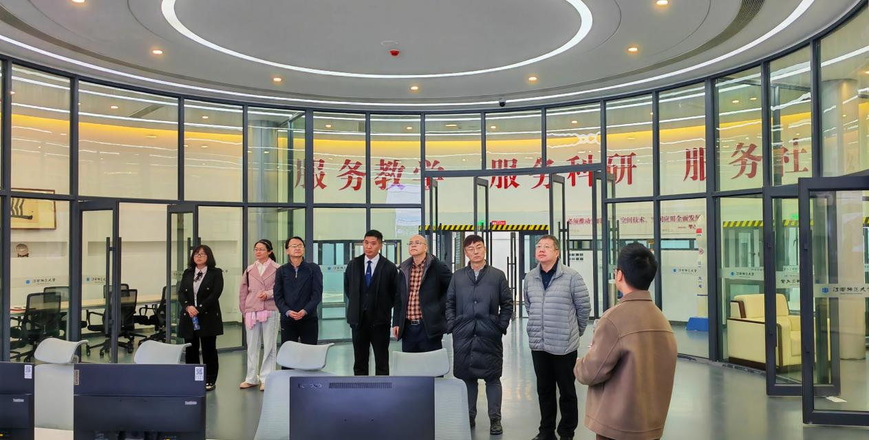 在江西师范大学,地理与环境学院执行院长罗津教授首先陪同调研组一行考察了鄱阳湖湿地生态监测平台、江西师范大学遥感卫星地面站、虚拟地理环境实验室等;随后,在交流会上转达了林晖院长对调研组的问候,向调研组详细介绍了学院发展概况、学科专业布局、人才培养模式及科研平台建设经验等,并与副院长丁明军、胡启武等,共同回应了我院调研组的相关问题。江西师范大学聚焦鄱阳湖流域开展的特色研究给调研组留下了深刻印象,也为其在2018年获批博士点并持续取得平台建设的新成果夯实了基础;该院依托外部力量激活内生动力的许多创造性探索,也为我院发展提供了有益借鉴。特别的,4日晚,江西师范大学党委常委、副校长钟业喜教授还盛情邀请调研组成员餐叙,并围绕两校的地理学科发展、本科人才培养、国内地理学学位点建设的总体情况等与调研组进行了深入交流,给学院发展提出了许多有益的建议。